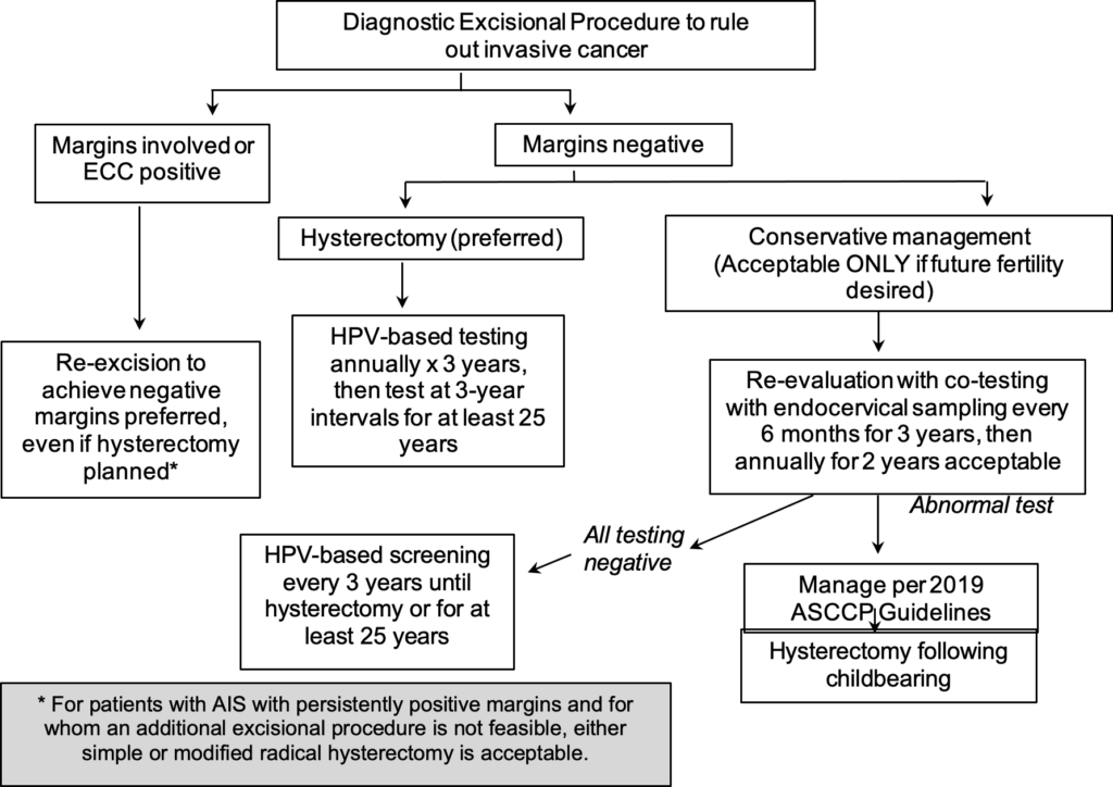 Figure 1. Management of AIS (adapted from Figure 11 of Perkins et al, 2019 ASCCP Risk-Based Management Consensus Guidelines for Abnormal Cervical Cancer Screening Tests and Cancer Precursors)